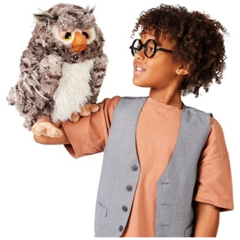 Long associated with knowledge and intelligence, the Wise Owl puppet flies in to teach us sage old lessons from across cultures. Rendered in soft poly plush with a movable beak and animated eyebrow pockets for winking, this storied character adds enchantment to playtime.