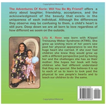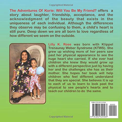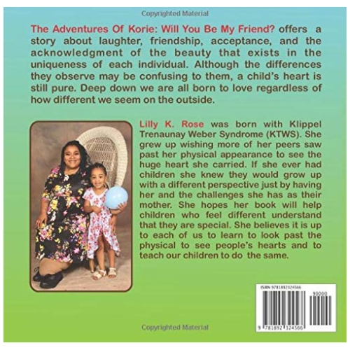 The Adventures Of Korie: Will You Be My Friend? offers a story about laughter, friendship, acceptance, and the acknowledgment of the beauty that exists in the uniqueness of each individual. Although the differences they observe may be confusing to them, a child’s heart is still pure. Deep down we are all born to love regardless of how different we seem on the outside.